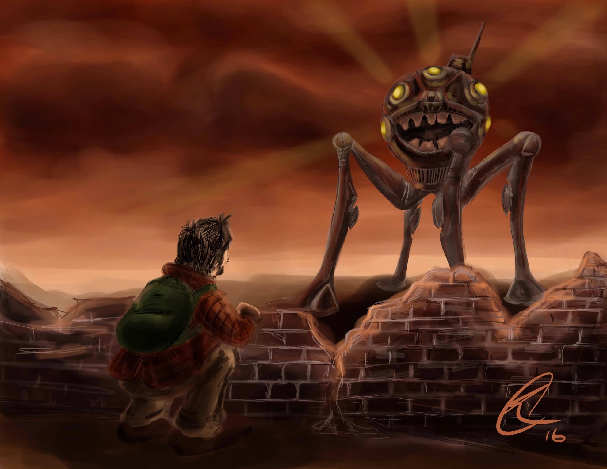 I curled up initially overwhelmed by the screaming. Then I came to the realization they were yelling at me in English. In fact, all they were doing was yelling. The giant machines made no move to attack, only detain me. From their closed in ranks, I guessed their goal was to force me back through the rift. My eyes finally adjusting, I could see destruction behind them. It looked like the devastation of a highly technological land.